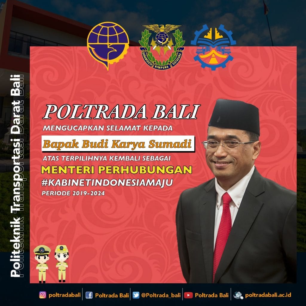 Terpilih Kembali Bapak Menteri Perhubungan Gianyar (23/10/2019) Poltrada Bali mengucapkan selamat atas terpilihnya kembali bapak Budi Karya Sumadi sebagai Menteri Perhubungan RI di kabinet kerja Indonesia Maju. Semoga Perhubungan semakin jaya ! di darat, laut maupun udara Artikel Dibaca : 1,416
