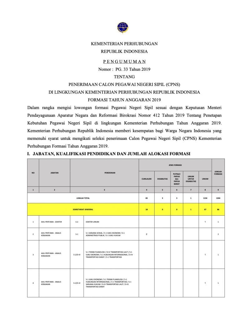 PENERIMAAN CALON PEGAWAI NEGERI SIPIL (CPNS)DI LINGKUNGAN KEMENTERIAN PERHUBUNGAN REPUBLIK INDONESIA FORMASI TAHUN ANGGARAN 2019 Artikel Dibaca : 1,108