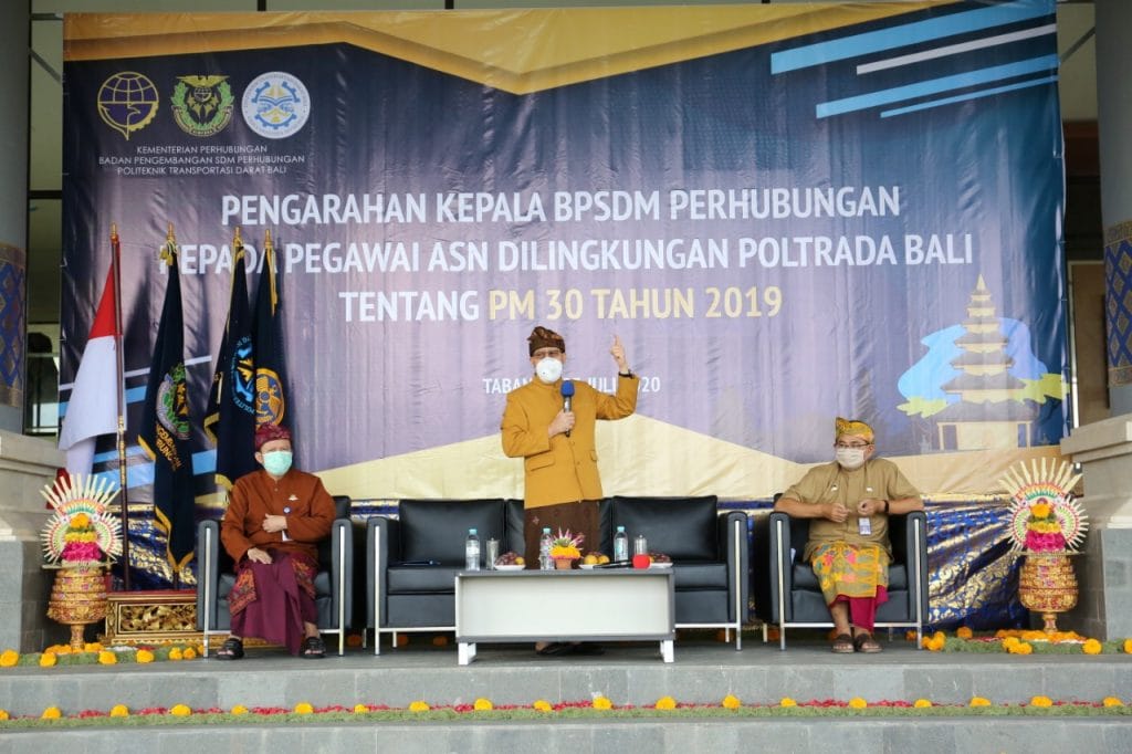 Dalam kunjungannya Kepala BPSDMP memberikan pengarahan kepada seluruh pegawai Poltrada Bali terkait PM 30 Tahun 2019 tentang Organisasi dan Tata Kerja Politeknik Transportasi Darat Bali. Ini dirasa perlu disampaikan karena mengingat Poltrada Bali masih masa transisi dari Balai menjadi Politeknik. Dimana yang dulu pada saat berbentuk Balai, merupakan kelas jauh dari Sekolah Tinggi Transportasi Darat (STTD) dan sekarang Poltrada sudah berdiri sendiri dan di tahun 2020 akan menerima Taruna untuk pertama kalinya.