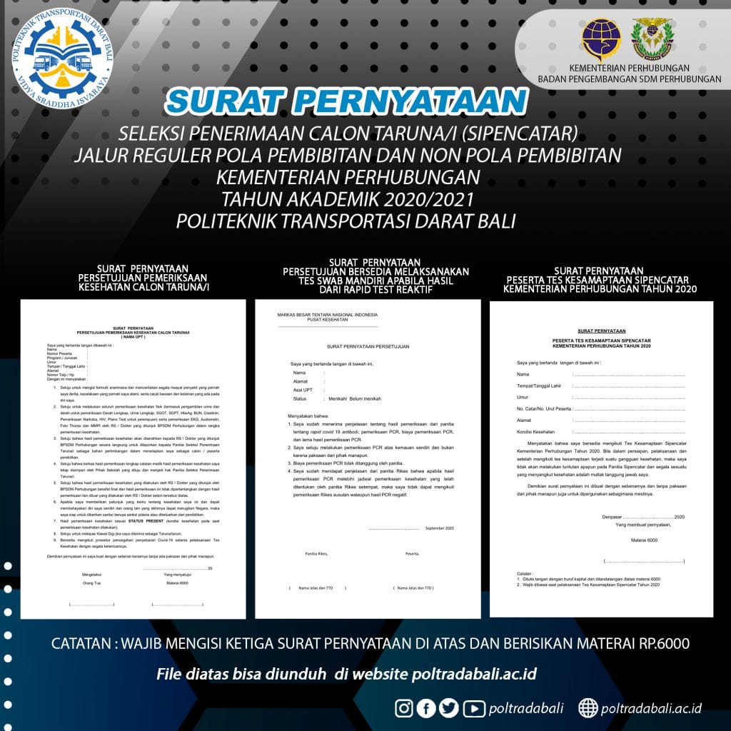 SURAT PERNYATAAN TES KESEHATAN DAN KESAMAPTAAN SIPENCATAR 2020 POLTRADA BALI File diatas bisa diunduh disini Artikel Dibaca : 1,453