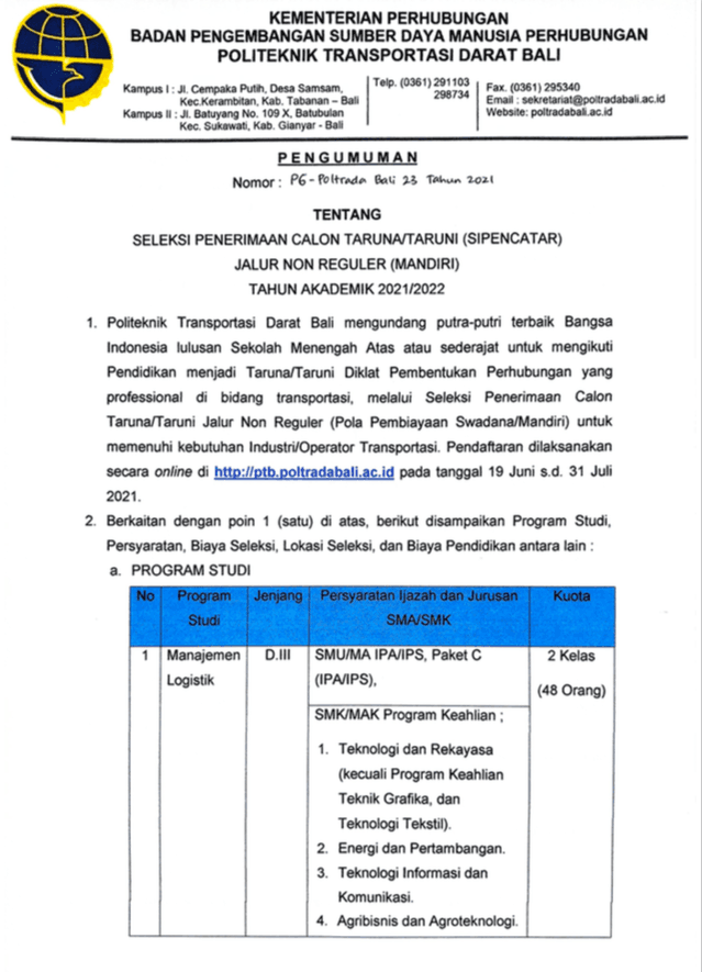 Seleksi Penerimaan Calon Taruna/Taruni Poltrada Bali Jalur Mandiri Tahun 2021