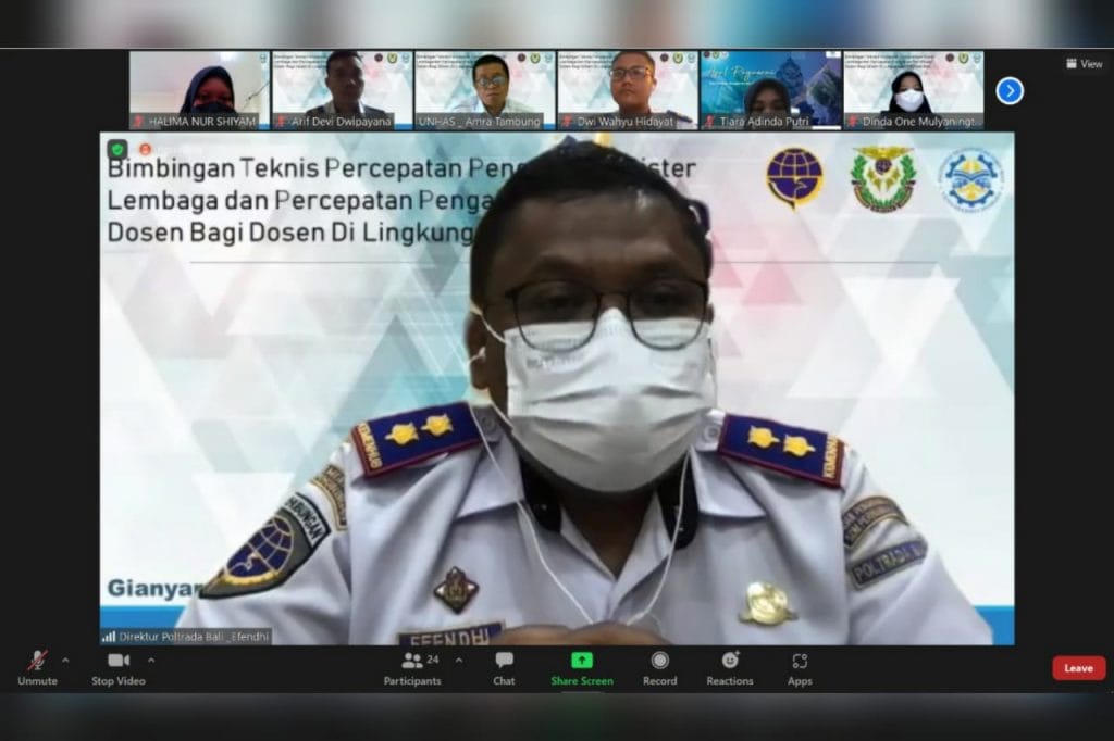 Kegiatan bimbingan teknis pengelolaan SISTER ini dilakukan secara daring dan diikuti oleh seluruh dosen di lingkungan Politeknik Transportasi Darat Bali. Kegiatan ini menghadirkan narasumber dari Universitas Hasanuddin Makassar bapak Amra Tambung, S.Sos. dan dibuka oleh bapak Efendhi Prih Raharjo selaku Direktur Politeknik Transportasi Darat Bali. Kegiatan bimbingan teknis ini merupakan kegiatan yang penting guna mempersiapkan, menambah wawasan, dan pembinaan karir bagi para dosen.