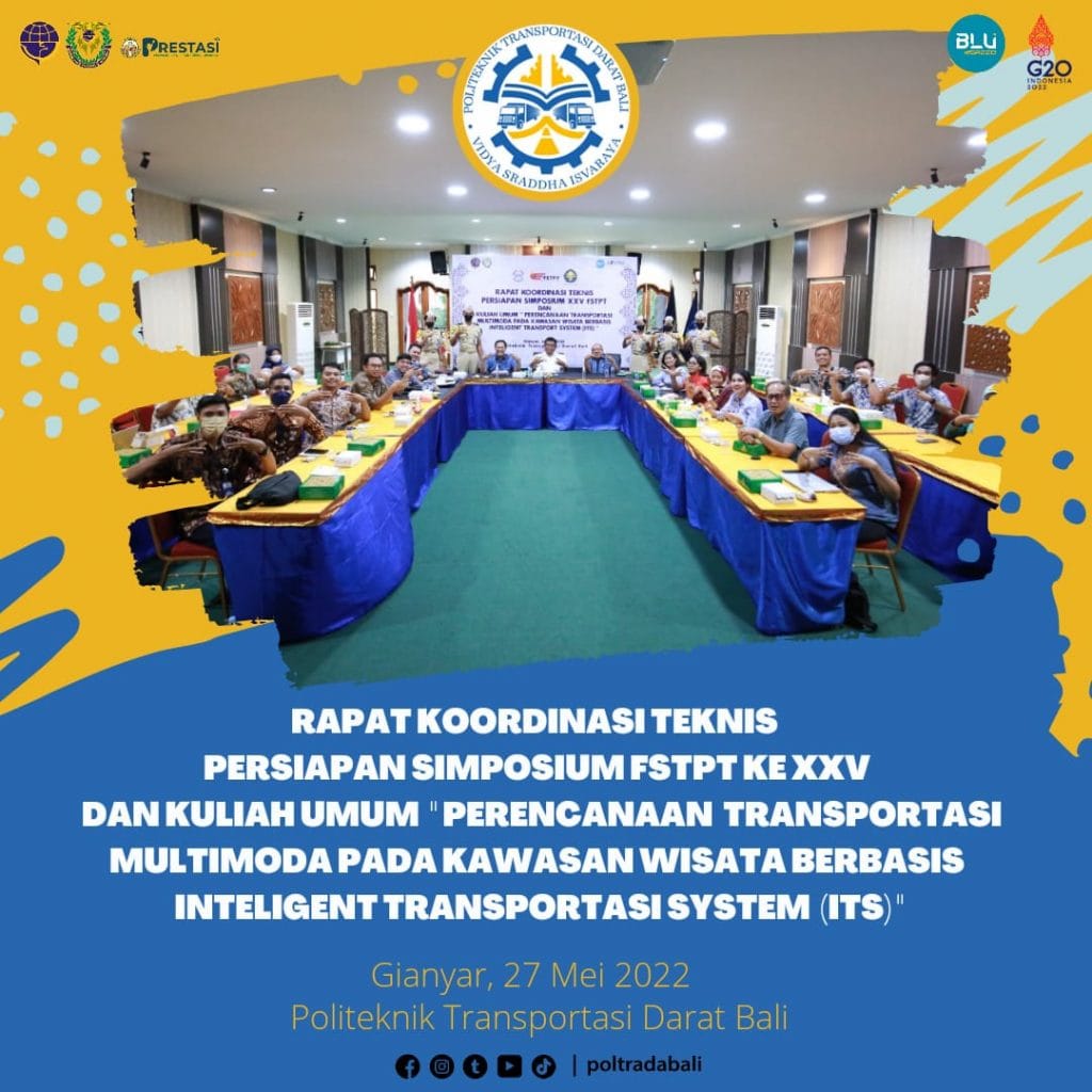 Politeknik Transportasi Darat Bali bersama dengan Pengurus Pusat Forum Studi Transportasi Perguruan Tinggi (FSTPT) melakukan Rapat Koordinasi terkait persiapan pelaksanaan Simposium Forum Studi Transportasi antar Perguruan Tinggi (FSTPT) XXV Tahun 2022 yang akan dilaksanakan pada akhir Nopember 2022 di Politeknik Transportasi Darat Bali. Kegiatan ini dilaksanakan di Gedung Aula Kampus 1 Politeknik Transportasi Darat Bali, Gianyar.