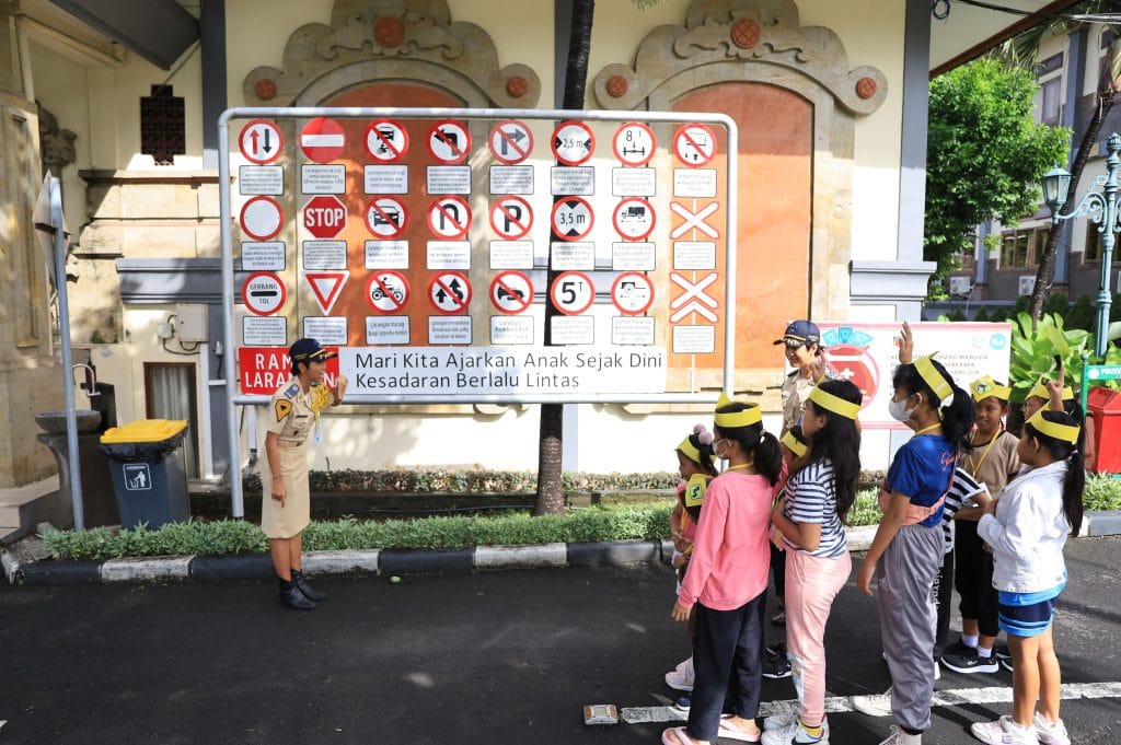 Dengan semangat penuh, anak-anak usia dini antusias mengikuti kegiatan pengenalan rambu-rambu lalu lintas yang berlangsung di area Kampus Gianyar. Mereka diberikan pengetahuan dasar mengenai rambu-rambu lalu lintas, termasuk tanda peringatan, larangan, dan petunjuk arah. Hal ini bertujuan untuk membangun kesadaran mereka sejak dini mengenai pentingnya berlalu lintas yang aman. Selain itu, kegiatan juga dilakukan dalam bentuk permainan ular tangga yang diintegrasikan dengan rambu-rambu lalu lintas. Dalam permainan ini, anak-anak dapat belajar secara interaktif dan menyenangkan tentang pentingnya mengikuti aturan lalu lintas dan keselamatan di jalan. Dengan pendekatan yang menyenangkan, diharapkan pesan-pesan kesadaran lalu lintas dapat lebih mudah dipahami oleh anak-anak.