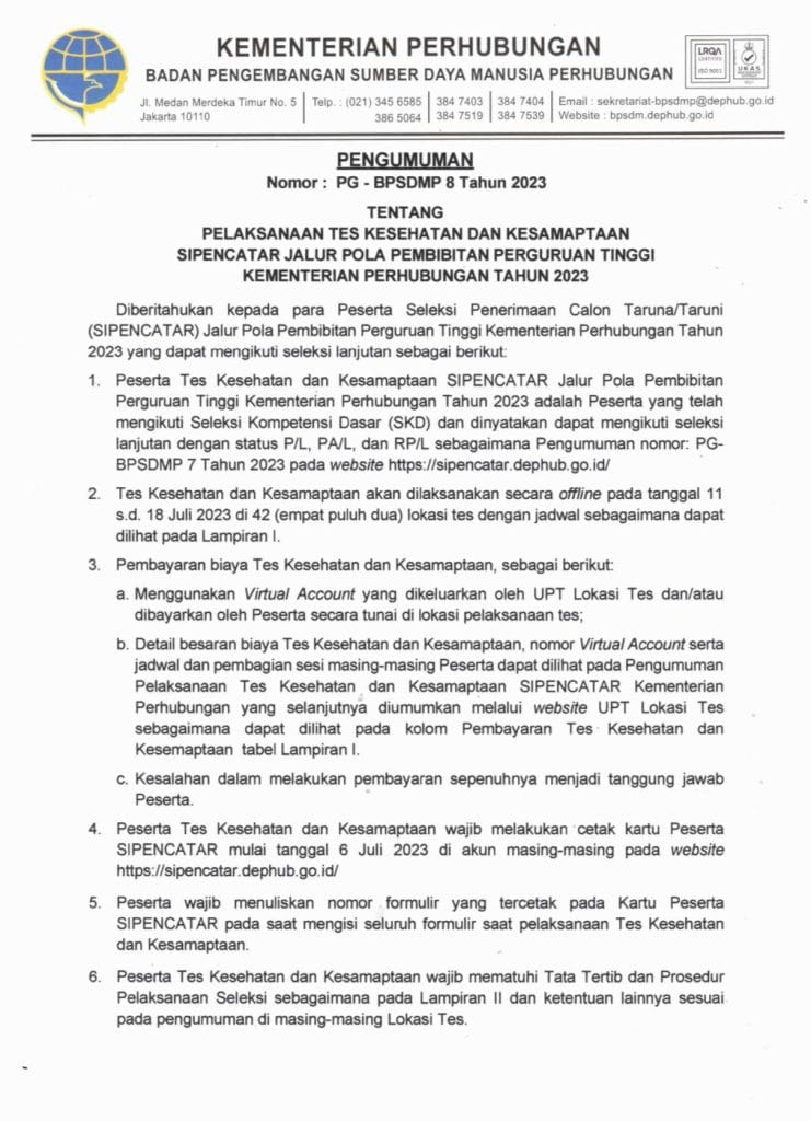 PENGUMUMAN TENTANG PELAKSANAAN TES KESEHATAN DAN KESEMAPTAAN SIPENCATAR JALUR POLA PEMBIBITAN PERGURUAN TINGGI KEMENTRIAN PERHUBUNGAN TAHUN 2023 PENGUMUMAN SELENGKAPNYA DAPAT DIUNDUH DISINI Artikel Dibaca : 832