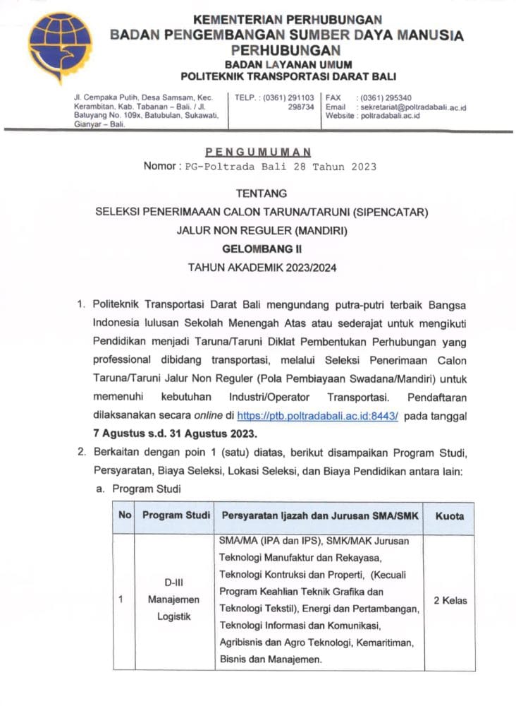 PENGUMUMAN TENTANG SELEKSI PENERIMAAN CALON TARUNA (SIPENCATAR) JALUR NON REGULER (MANDIRI)GELOMBANG II POLTRADA BALI TAHUN 2023 PENGUMUMAN BISA DIUNDUH DISINIDISINI Artikel Dibaca : 1,226