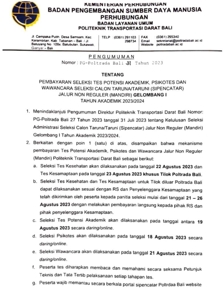 PENGUMUMAN PEMBAYARAN SELEKSI TPA, PSIKOTES DAN WAWANCARA CALON TARUNA/I SIPENCATAR JALUR NON REGULER (MANDIRI) GELOMBANG I PENGUMUMAN BISA DIUNDUH DISINI Artikel Dibaca : 910