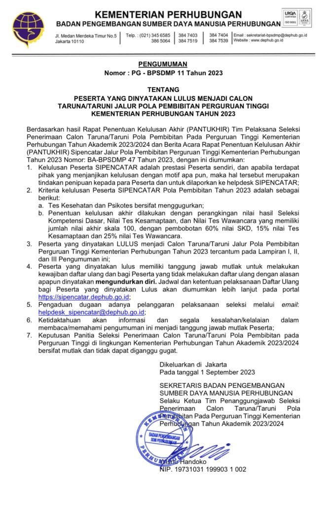 PENGUMUMAN PESERTA YANG DINYATAKAN LULUS MENJADI CALON TARUNA/TARUNI JALUR POLA PEMBIBITAN PERGURUAN TINGGI KEMENTERIAN PERHUBUNGAN TAHUN 2023 PENGUMUMAN SELENGKAPNYA DAPAT DIUNDUH DISINI Artikel Dibaca : 1,207