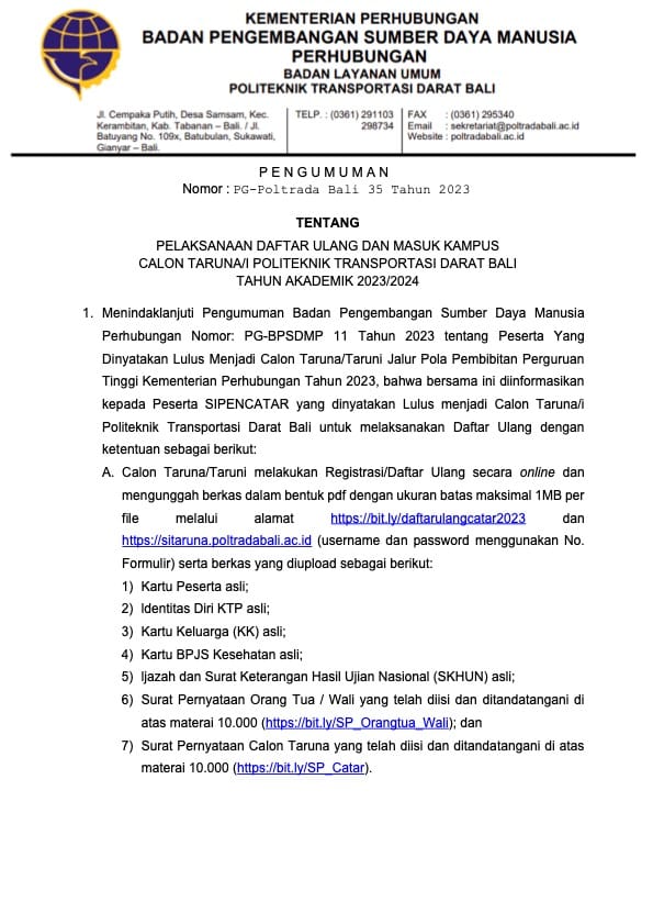 PENGUMUMAN PELAKSANAAN DAFTAR ULANG DAN MASUK KAMPUS CALON TARUNA/I POLITEKNIK TRANSPORTASI DARAT BALI TAHUN AKADEMIK 2023/2024 PENGUMUMAN BISA DIUNDUH DISINI Artikel Dibaca : 1,024