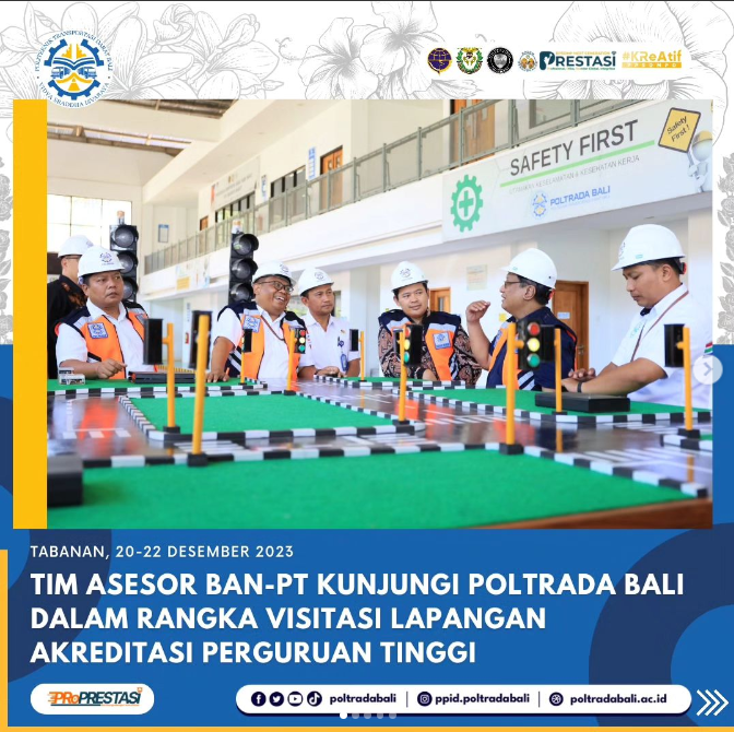 Tabanan – Politeknik Transportasi Darat Bali pada 20-22 Desember 2023, menerima sekaligus menyelenggarakan serangkaian kegiatan Visitasi Lapangan Akreditasi Perguruan Tinggi yang dilakukan oleh Tim Asesor BAN-PT bertempat di Kampus Tabanan.