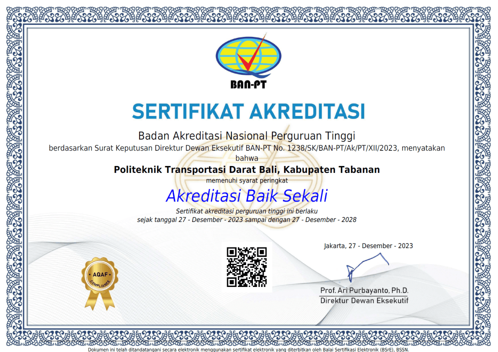 Tabanan – POLTRADA BALI pada tanggal 20-22 Desember 2023 kemarin telah melaksanakan Visitasi Lapangan Akreditasi Perguruan Tinggi yang bertempat di Kampus Tabanan. Kegiatan visitasi tersebut dibuka secara langsung oleh bapak Dr. Ir. Efendhi Prih Raharjo, S.T., S.SiT., M.T selaku Direktur POLTRADA BALI dan dihadiri oleh Tim Asesor dari Badan Akreditasi Nasional Perguruan Tinggi (BAN-PT) Prof. Dr. Dwi Aries Himawannto, S.T., M.T, Dr. Saepudin Nirwan, S.Kom., M.Kom, Tim dari Pusat Pengembangan Sumber Daya Manusia Perhubungan Darat, Tim Akreditasi POLTRADA BALI, Taruna, Lulusan, serta Pengguna Lulusan.