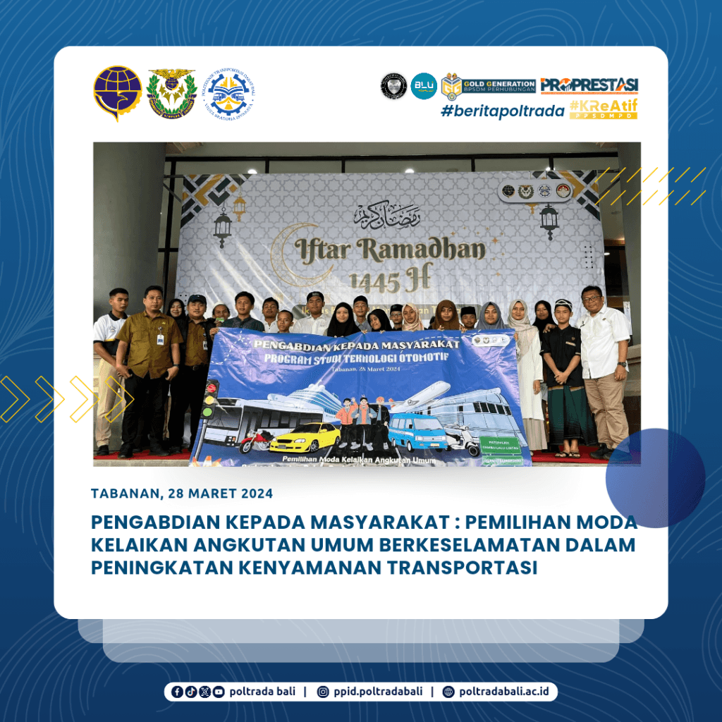 Tabanan, 28 Maret 2024 – Politeknik Transportasi Darat Bali menggelar acara pengabdian kepada masyarakat dengan tema “Pemilihan Moda Kelaikan Angkutan Umum Berkeselamatan Dalam Peningkatan Kenyamanan Transportasi” di Kampus Tabanan, Poltrada Bali. Kegiatan ini bertujuan untuk memberikan pemahaman kepada masyarakat, khususnya anak-anak, mengenai pentingnya memilih moda transportasi yang aman dan nyaman. Kegiatan ini juga dilakukan bersamaan dengan pelaksanaan kegiatan Buka Bersama (Bukber) dalam menyambut bulan puasa Tahun 2024 yang diikuti oleh anak-anak Panti Asuhan.