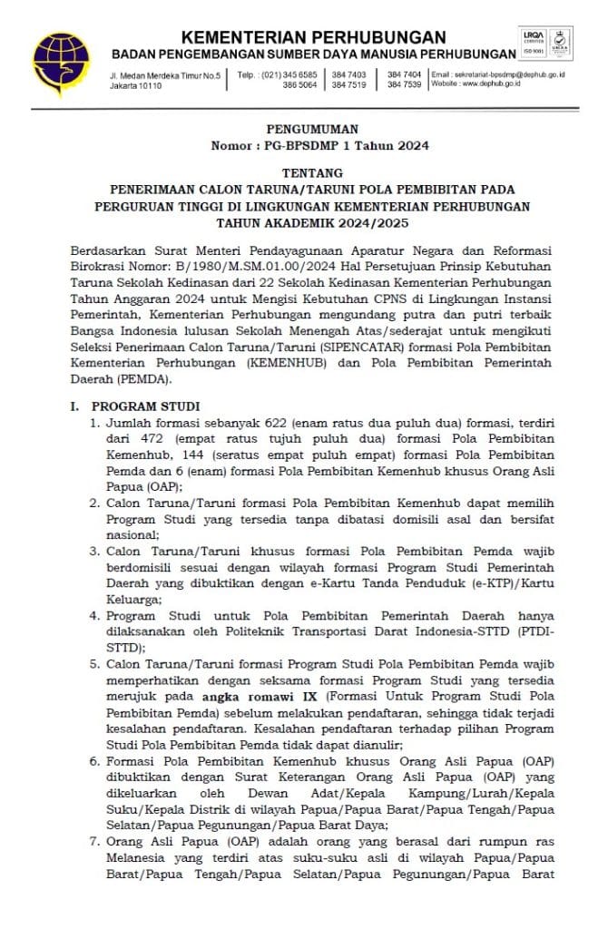 PENGUMUMAN TENTANG PENERIMAAN CALON TARUNA/TARUNI POLA PEMBIBITAN PADA PERGURUAN TINGGI DI LINGKUNGAN KEMENTERIAN PERHUBUNGAN TAHUN AKADEMIK 2024/2025 PENGUMUMAN BISA DIUNDUH DISINI Artikel Dibaca : 3,329