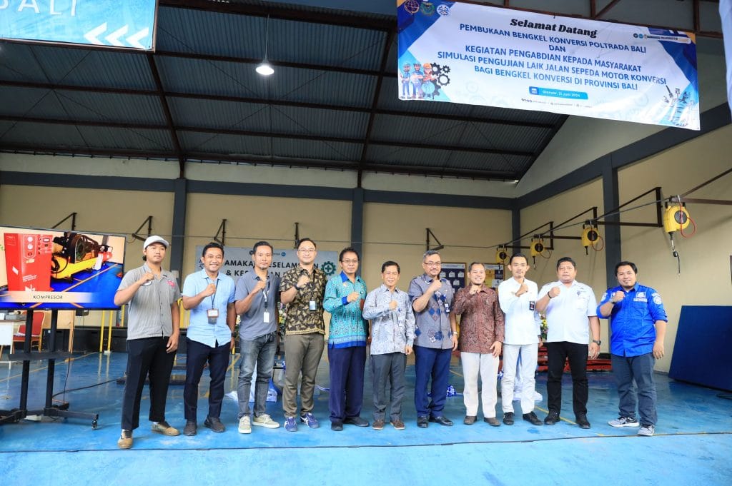 Gianyar, 21 Juni 2024 – Politeknik Transportasi Darat Bali (Poltrada Bali) meresmikan Bengkel Konversi dan mengadakan kegiatan pengabdian kepada masyarakat berupa simulasi pengujian laik jalan sepeda motor konversi. Acara ini dihadiri oleh berbagai tokoh penting di sektor transportasi dan kelistrikan Indonesia. Hadir dalam acara peresmian adalah Heri Prabowo, S.T., M.T., Kepala Balai Pengujian Laik Jalan dan Sertifikasi Kendaraan Bermotor (BPLJSKB); Slamet, M.T., Ph.D., Koordinator Bidang Ketenagalistrikan Balai Besar Survey dan Pengujian Ketenagalistrikan (BBSP KEBTKE) Kementerian ESDM; perwakilan dari PT PLN UID Bali (Perusahaan Listrik Negara); dan Syafek Jamhari, M.Pd., Kepala Bidang Pelatihan Pusbang Darat.