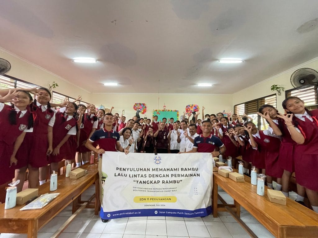 Denpasar, 30 Juli 2024 – Politeknik Transportasi Darat Bali menyelenggarakan kegiatan Pengabdian kepada Masyarakat (PkM) berupa Pengenalan Rambu Lalu Lintas Melalui Permainan “Tangkap Rambu” Pada Siswa Siswi di SDN 11 Peguyangan. Kegiatan ini bertujuan untuk memberikan pemahaman kepada siswa siswi mengenai arti dari rambu lalu lintas di jalan raya serta manfaat dari dipasangnya rambu lalu lintas. PkM ini terdiri dari Dosen dan Mahasiswa Poltrada bali sebagai tim PkM serta siswa siswi SDN 11 Peguyangan sebagai peserta didampingi bapak ibu guru mereka.