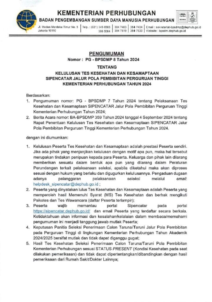 PENGUMUMAN TENTANG KELULUSAN TES KESEHATAN DAN KESAMPTAAN SIPENCATAR POLBIT 2024 PENGUMUMAN BISA DIUNDUH DISINI Artikel Dibaca : 1,189