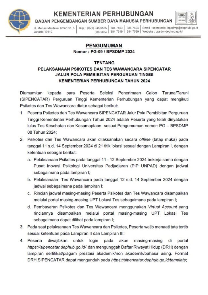 PENGUMUMAN TENTANG PELAKSANAAN PSIKOTES DAN TES WAWANCARA SIPENCATAR JALUR POLBIT 2024 BISA DIUNDUH DISINI