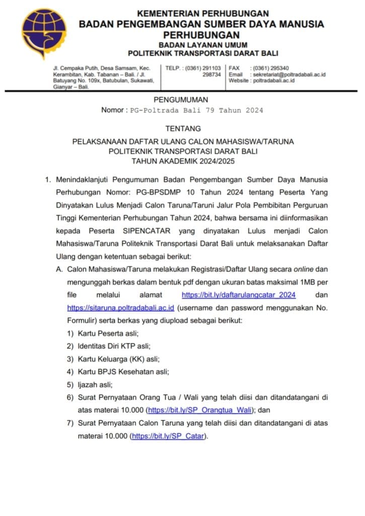 PENGUMUMAN TENTANG PELAKSANAAN DAFTAR ULANG CALON MAHASISWA/TARUNA POLITEKNIK TRANSPORTASI DARAT BALI JALUR POLA PEMBIBITAN (POLBIT) TAHUN AKADEMIK 2024/2025 PENGUMUMAN BISA DIUNDUH DISINI Artikel Dibaca : 1,872