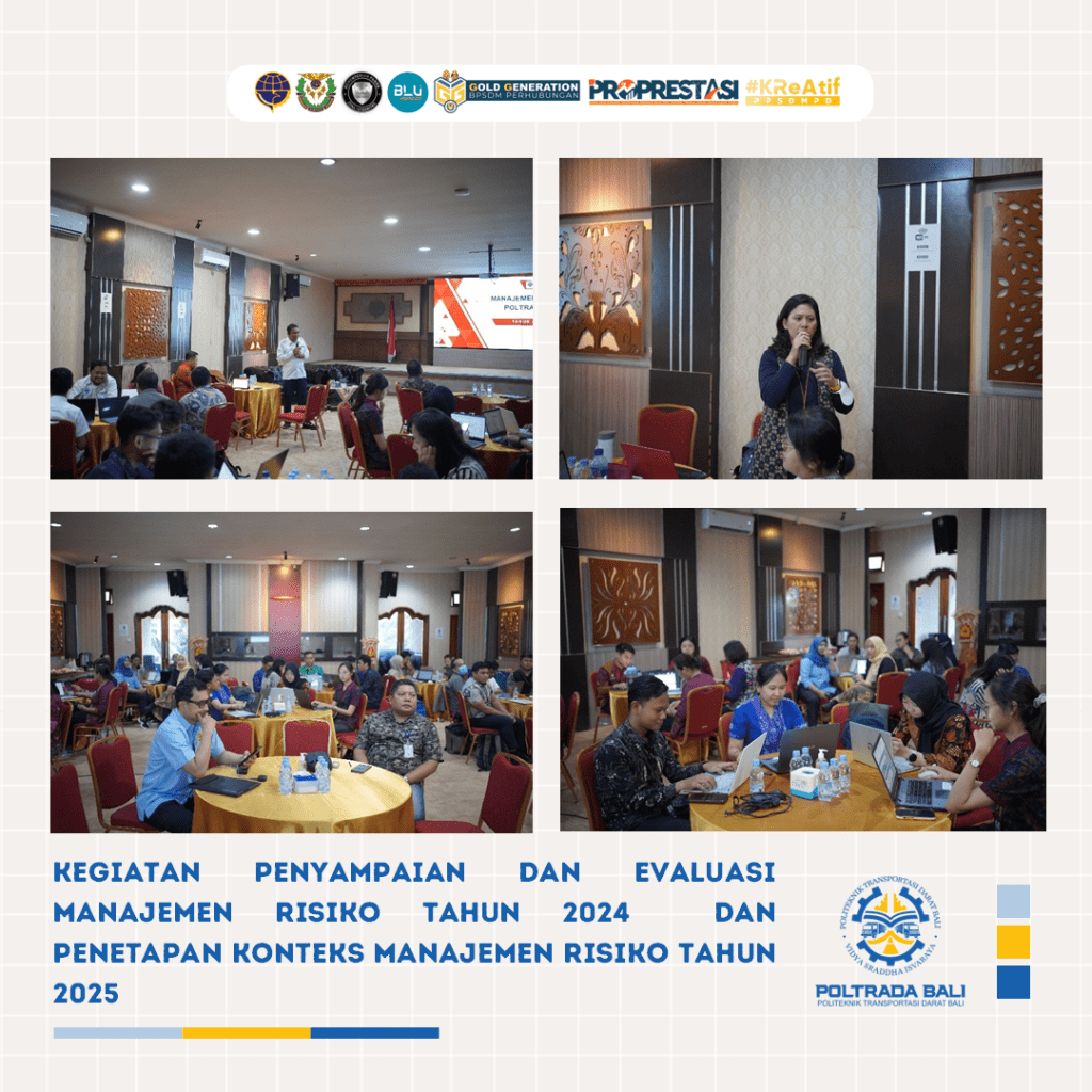 Pada hari Kamis tanggal 09 Januari 2025 dilaksanakan Kegiatan Penyampaian dan Evaluasi Manajemen Risiko Tahun 2024 dan Penetapan Konteks Manajemen Risiko 2025 yang di buka oleh Direktur Politeknik Transportasi Darat Bali Bapak Dr. Ir. I Made Suraharta, S.T., S.Si.T., M.T., IPM. Penyampaian dari Bapak Direktur Poltrada Bali ke seluruh Unit Pemilik Risiko (UPR) pada kesempatan ini yaitu seluruh Manajemen Poltrada Bali, bahwa dalam Mengidentifikasi Risiko yaitu upaya untuk mempertahankan nilai yang Instansi sudah tetapkan pada penetapan konteks awal tahun 2024.