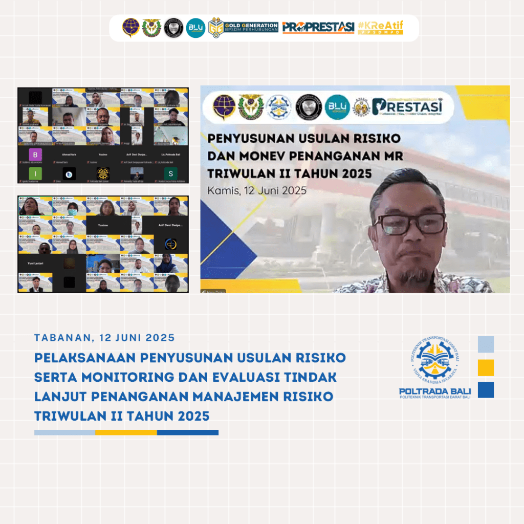 Kegiatan ini dilaksanakan dalam rangka mendukung penerapan manajemen risiko secara berkelanjutan di lingkungan Politeknik Transportasi Darat Bali (Poltrada Bali). Fokus kegiatan meliputi penyusunan usulan risiko baru yang relevan dengan kondisi pada triwulan II, serta monitoring dan evaluasi terhadap tindak lanjut penanganan risiko yang telah ditetapkan pada periode Triwulan I.