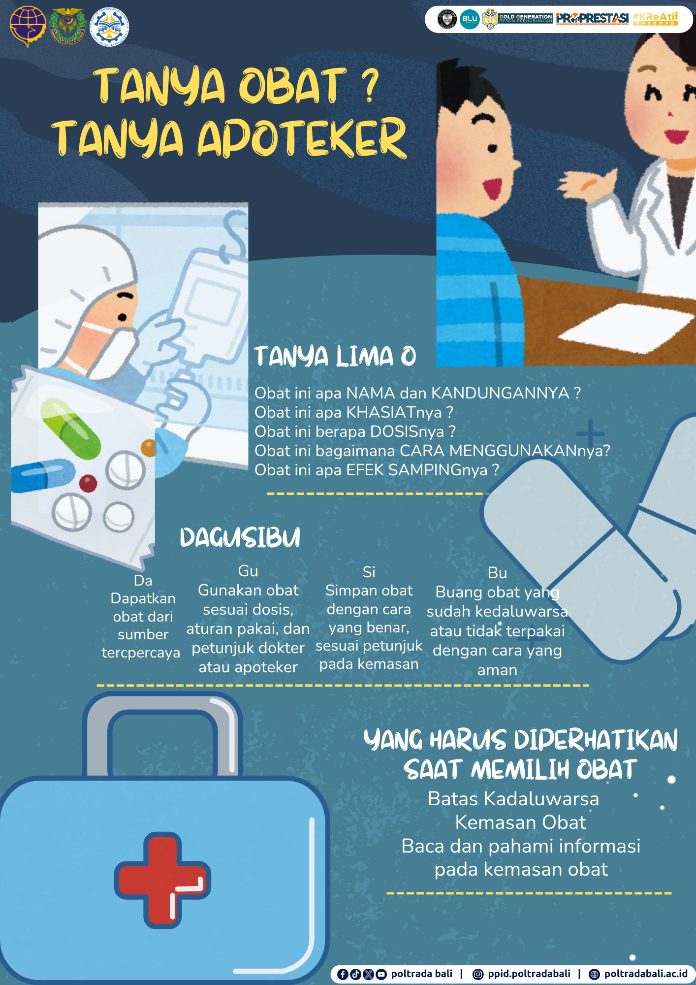 Tabanan, 18 Juni 2025 – Klinik Politeknik Transportasi Darat (Poltrada) Bali mengadakan kegiatan penyuluhan kesehatan bertajuk “Penggunaan Obat yang Tepat” kepada mahasiswa dan mahasiswi Tingkat I. Kegiatan ini dilaksanakan sebagai bagian dari upaya edukasi dini dalam menciptakan generasi muda yang sadar akan pentingnya penggunaan dan penyimpanan obat secara bijak dan aman.