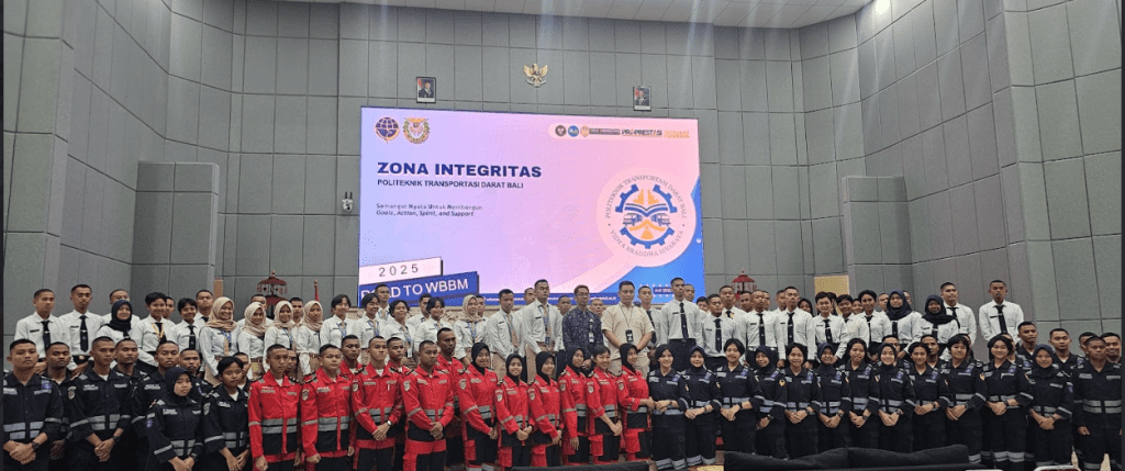 Tabanan (08/07) – Politeknik Transportasi Darat Bali kembali menegaskan komitmennya dalam pembangunan Zona Integritas menuju Wilayah Birokrasi Bersih dan Melayani (WBBM) melalui kegiatan sosialisasi yang melibatkan seluruh elemen, termasuk mahasiswa. Kegiatan diselenggarakan di Gedung Serba Guna Garuda Laksana Poltrada Bali. Kegiatan ini tidak hanya ditujukan bagi pegawai dan dosen, tetapi juga mengajak para mahasiswa untuk turut serta memahami nilai-nilai dasar integritas, transparansi, dan akuntabilitas dalam lingkungan kampus. Mahasiswa sebagai bagian dari civitas akademika memiliki peran penting dalam menciptakan budaya antikorupsi dan menjadi agen perubahan, baik di lingkungan pendidikan maupun saat mereka terjun ke dunia kerja nantinya.
