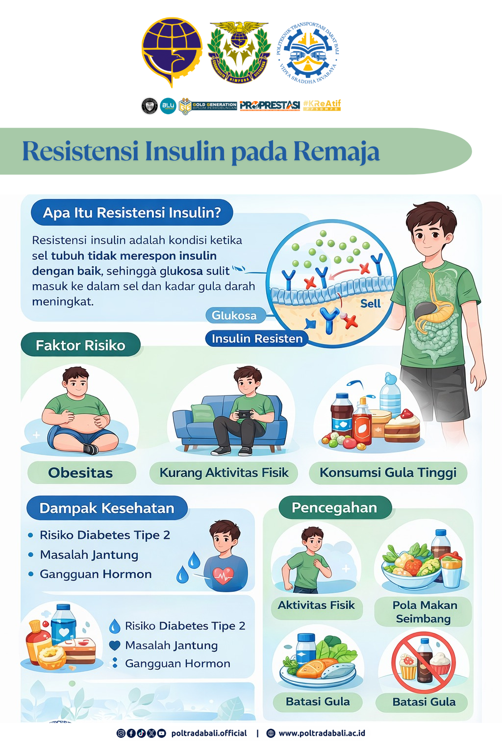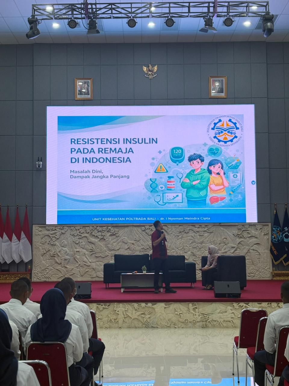 Tabanan, 27 Januari 2026 Politeknik Transportasi Darat Bali (Poltrada Bali) melaksanakan kegiatan penyuluhan kesehatan dengan tema “Resistensi Insulin pada Remaja” yang ditujukan kepada mahasiswa/i Tingkat I. Kegiatan ini diselenggarakan di Gedung Garuda Laksana Poltrada Bali dan diikuti oleh seluruh mahasiswa baru dengan antusias.