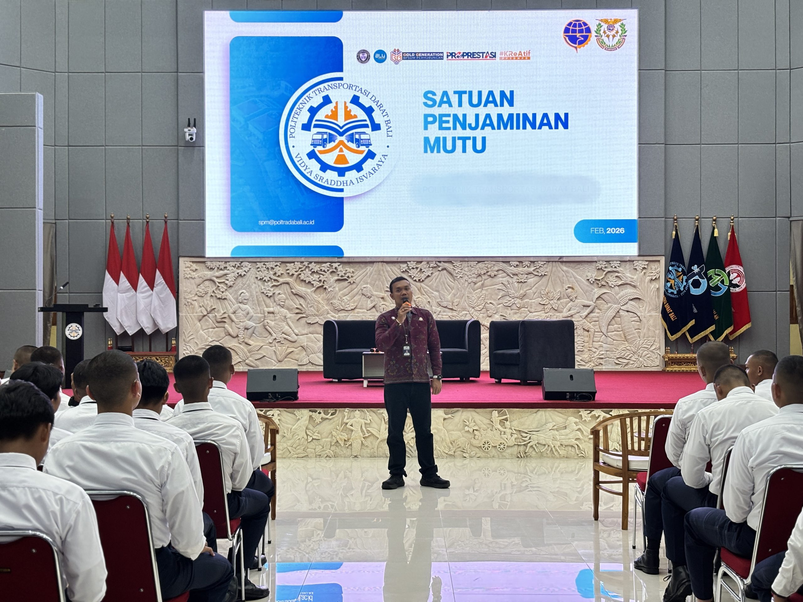 Tabanan, 3 Februari 2026 — Satuan Penjaminan Mutu (SPM) Politeknik Transportasi Darat (Poltrada) Bali melaksanakan kegiatan Sosialisasi Evaluasi Dosen dan Layanan oleh Mahasiswa yang bertempat di Gedung Serba Guna Garuda Laksana, Kampus Poltrada Bali Tabanan. Kegiatan ini diikuti oleh seluruh mahasiswa aktif yang berada di Kampus Tabanan sebagai bagian dari upaya penguatan budaya mutu di lingkungan perguruan tinggi. Kegiatan sosialisasi dipimpin oleh Kepala Satuan Penjaminan Mutu Poltrada Bali dan diawali dengan pemaparan mengenai peran SPM dalam menjamin mutu pendidikan tinggi serta pentingnya keterlibatan mahasiswa dalam proses evaluasi berkala dan berkelanjutan. Mahasiswa sebagai pengguna layanan pendidikan memiliki peran strategis dalam memberikan umpan balik terhadap proses pembelajaran dan layanan institusi.