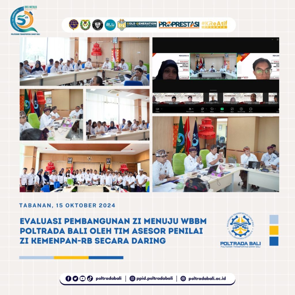 Tabanan – Politeknik Transportasi Darat Bali pada Selasa, 15 Oktober 2024 menyelenggarakan serangkaian kegiatan Evaluasi Pembangunan Zona Integritas menuju Wilayah Birokrasi Bersih dan Melayani (WBBM) yakni wawancara oleh Tim Asesor Penilai Zona Integritas Kementerian Pendayagunaan Aparatur Negara dan Reformasi Birokrasi secara Daring.