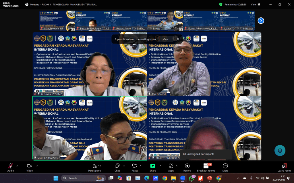 Tabanan, 20 Februari 2024 — Kegiatan Pengabdian kepada Masyarakat (PkM) berskala internasional dilaksanakan secara bersamaan dengan Workshop Sinergi Peningkatan Pemanfaatan Terminal Tipe A. Kegiatan ini mengusung tema “Inovasi, Kebijakan, dan Kolaborasi Menuju Terminal yang Selamat, Nyaman, dan Efisien” yang merupakan kegiatan kolaborasi antara Politeknik Transportasi Darat Bali, Politeknik Transportasi Darat Indonesia – STTD, dan Politeknik Keselamatan Transportasi Jalan Tegal serta dihadiri oleh berbagai pemangku kepentingan, baik dari dalam maupun luar negeri.