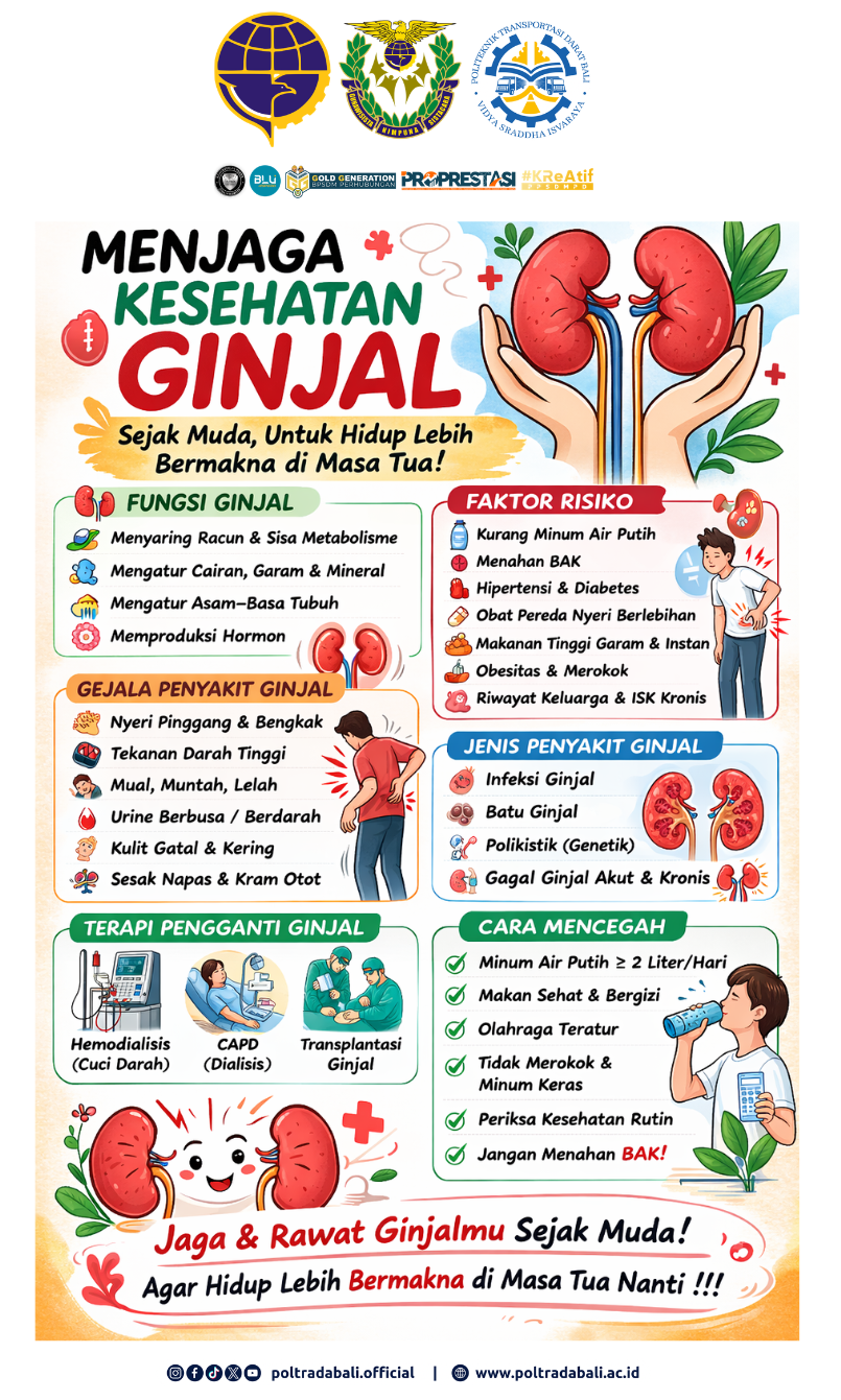 Tabanan, 3 Maret 2026, Unit Kesehatan Politeknik Transportasi Darat Bali melaksanakan kegiatan penyuluhan kesehatan tentang Menjaga Kesehatan Ginjal kepada mahasiswa/i Poltrada Bali yang bertempat di Gedung Garuda Laksana.