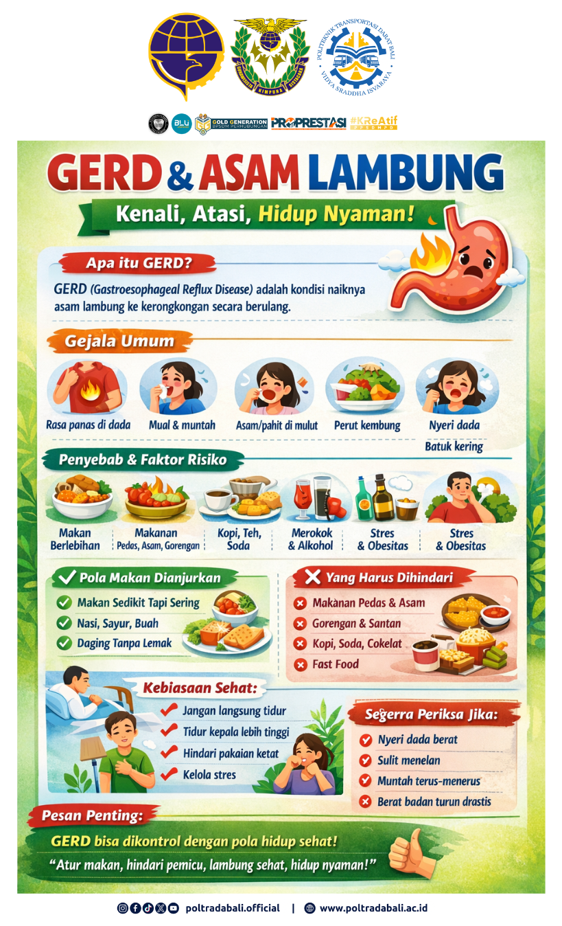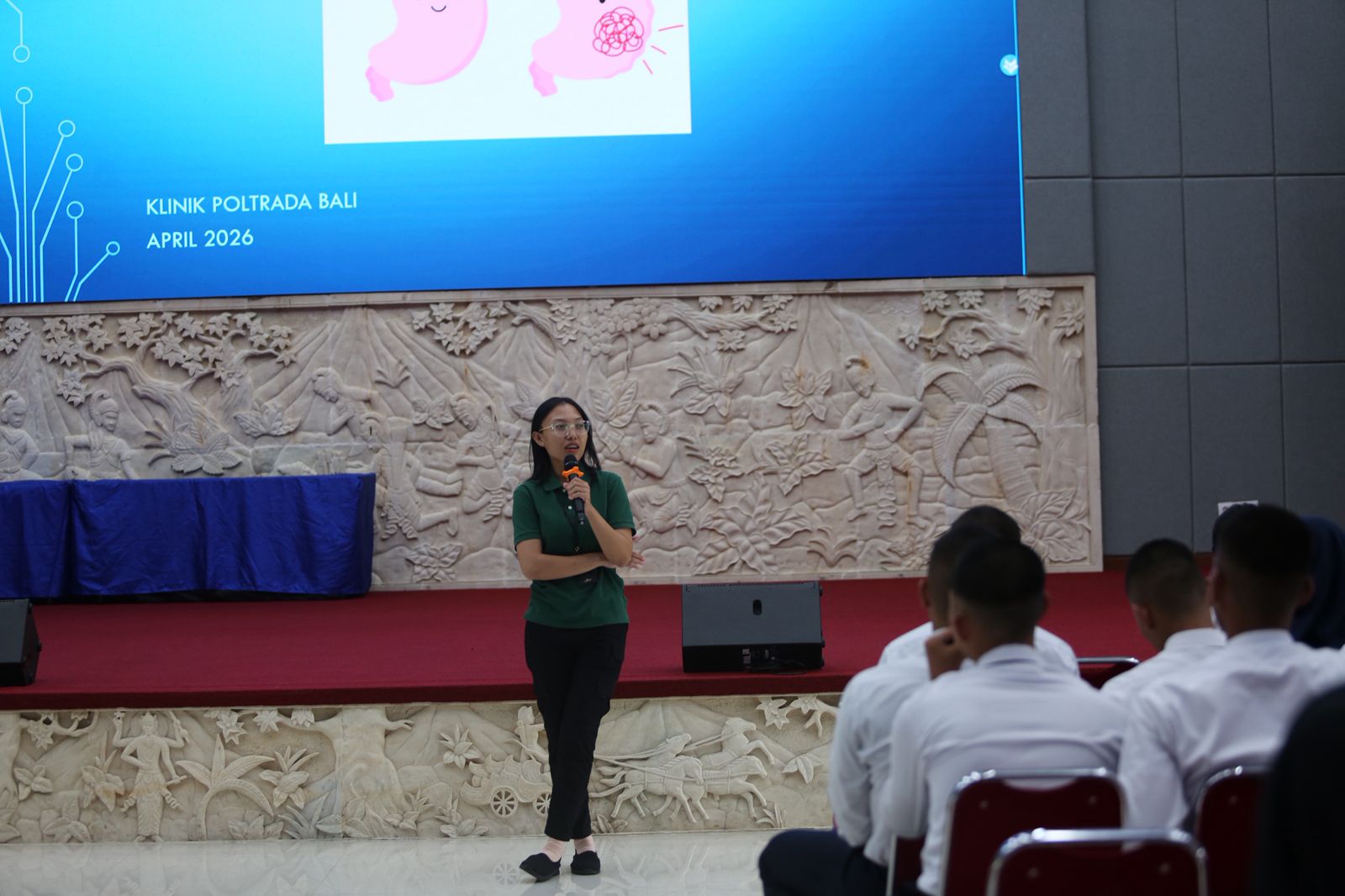 Tabanan, 14 April 2026, Poltrada Bali melalui Unit Kesehatan menyelenggarakan kegiatan penyuluhan kesehatan dengan tema “Pencegahan dan Penanganan Asam Lambung pada Remaja dan Dewasa Muda” yang ditujukan kepada Mahasiswa/i Tingkat I. Kegiatan ini dilaksanakan di Gedung Garuda Laksana Poltrada Bali dan berlangsung dengan tertib serta penuh antusias dari seluruh peserta.