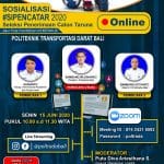 Senin, 15 Juni 2020 – Politeknik Transportasi Darat Bali melaksanakan Sosialisasi Seleksi Penerimaan Calon Taruna Tahun 2020 secara Online, Sosialisasi ini dilaksanakan sesuai dengan arahan Bapak Sekretaris Badan SDM Perhubungan untuk memperkenalkan sekolah kedinasan di lingkungan Badan Pengembangan SDM Perhubungan, Kementerian Perhubungan kepada masyarakat umum ditengah masa pandemi Covid-19 ini. Adapun Narasumber dalam Sosialisasi kali ini yaitu, Direktur Poltrada Bali sebagai pembicara utama, Kabag Administrasi Akademik dan Ketarunaan Sebagai Pembicara Ke-2, Serta Wakil Direktur III Poltrada Bali sebagai Pembicara ke-3.
