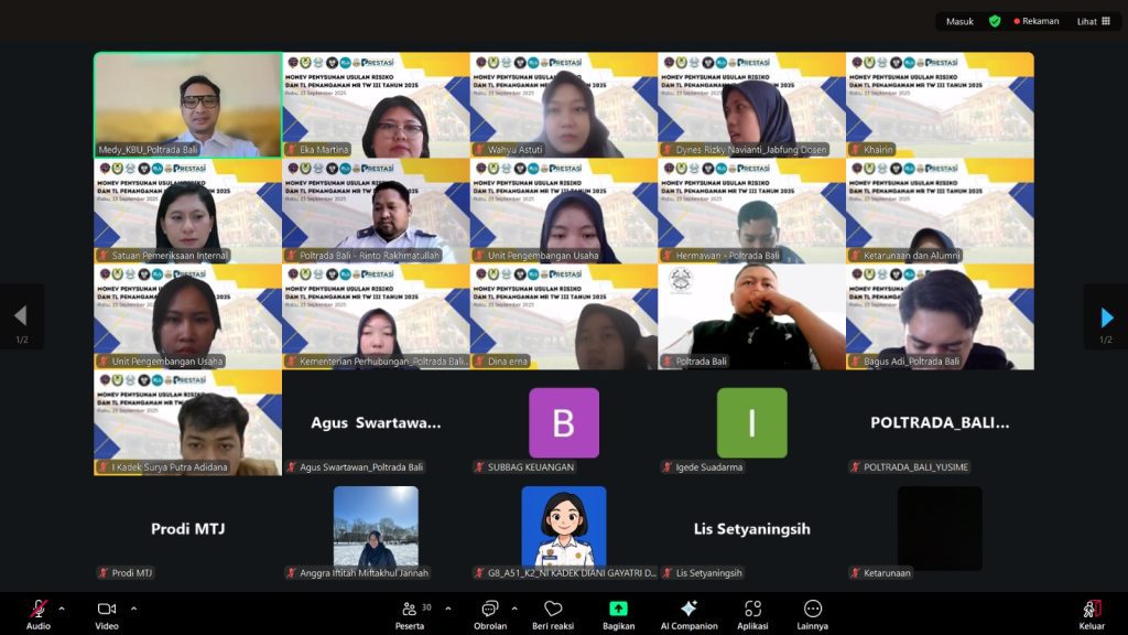 Tim Satuan Pengawasan Internal (SPI) Politeknik Transportasi Darat Bali telah melaksanakan kegiatan Monitoring dan Evaluasi (Monev) pelaksanaan Diklat Dasar Transportasi Darat Angkatan I pada tanggal 17 Oktober 2025 bertempat di Kampus I Gianyar Politeknik Transportasi Darat Bali.