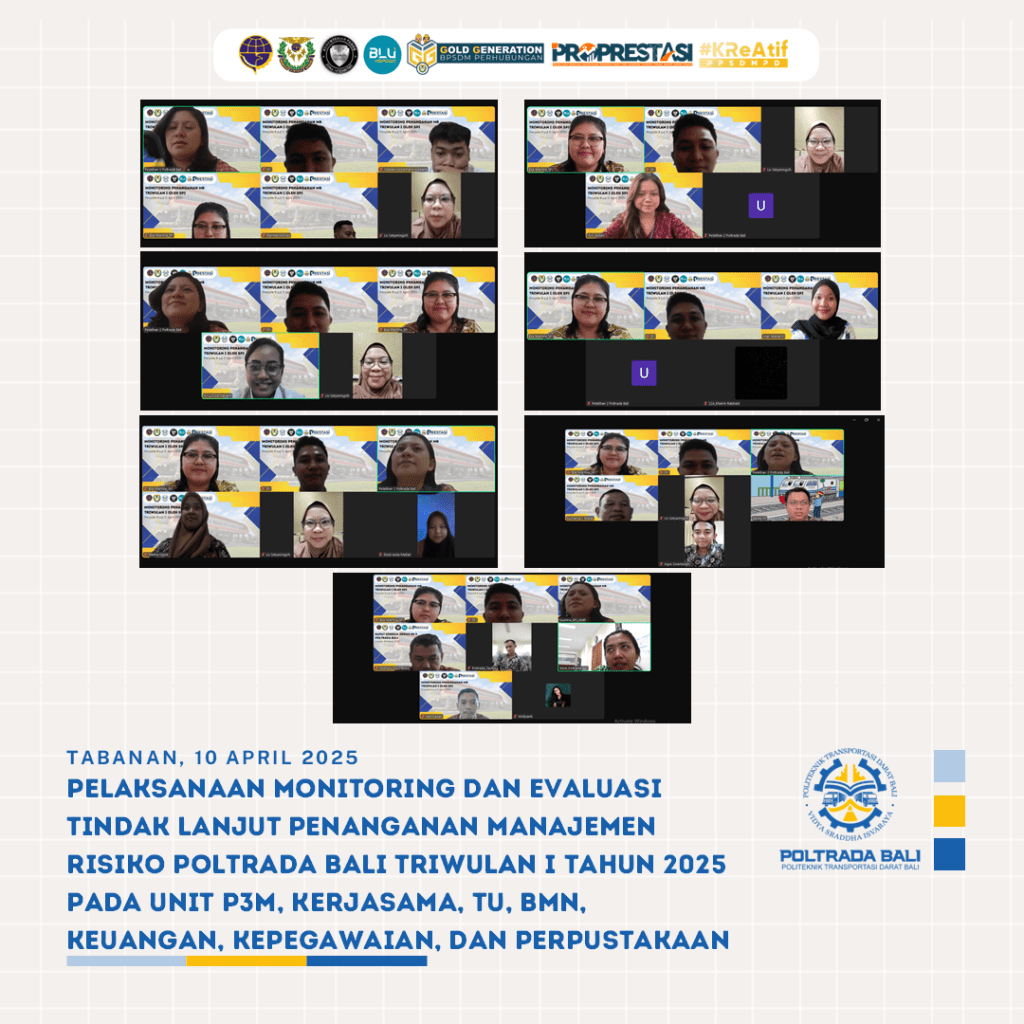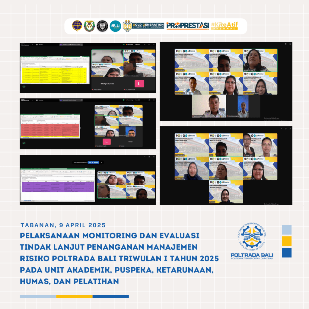 Kegiatan ini dilaksanakan dalam rangka mendukung penerapan manajemen risiko secara berkelanjutan di lingkungan Politeknik Transportasi Darat Bali (Poltrada Bali). Fokus kegiatan meliputi penyusunan usulan risiko baru yang relevan dengan kondisi pada triwulan II, serta monitoring dan evaluasi terhadap tindak lanjut penanganan risiko yang telah ditetapkan pada periode Triwulan I.