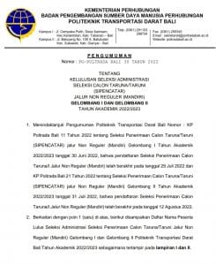 Pada tahun 2019 dengan diterbitkannya Peraturan Menteri Perhubungan Republik Indonesia, dengan Nomor PM 30 tahun 2019 pada tanggal 10 Mei 2019 tentang Organisasi dan Tata Kerja Politeknik Transportasi Darat Bali. maka Balai Pendidikan dan Pelatihan Transpormasi Darat Bali berubah nomenklatur menjadi Politeknik Transportasi Darat Bali (POLTRADA Bali).